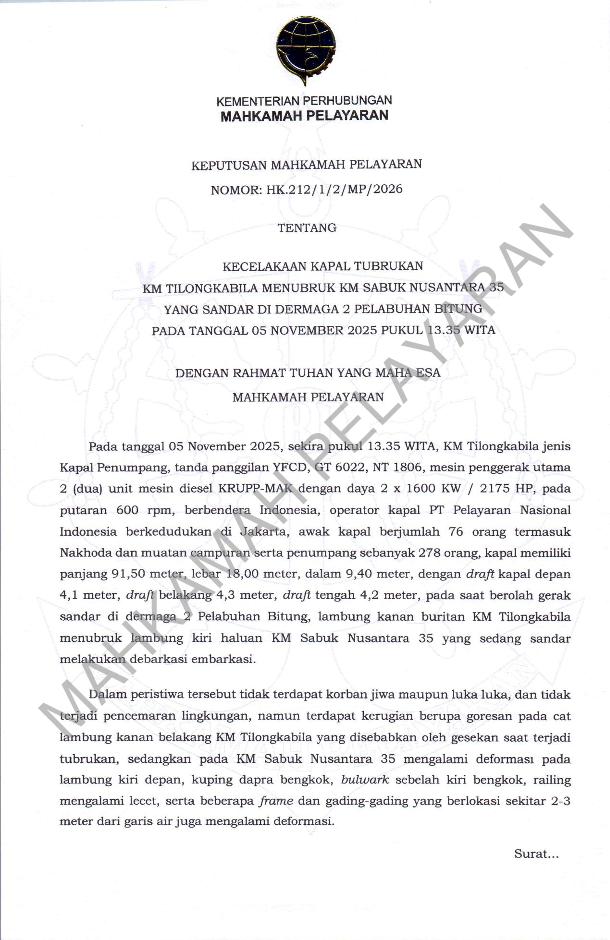 KECELAKAAN KAPAL TUBRUKAN KM TILONGKABILA MENUBRUK KM SABUK NUSANTARA 35 YANG SANDAR DI DERMAGA 2 PELABUHAN BITUNG PADA TANGGAL 05 NOVEMBER 2025 PUKUL 13.35 WITA